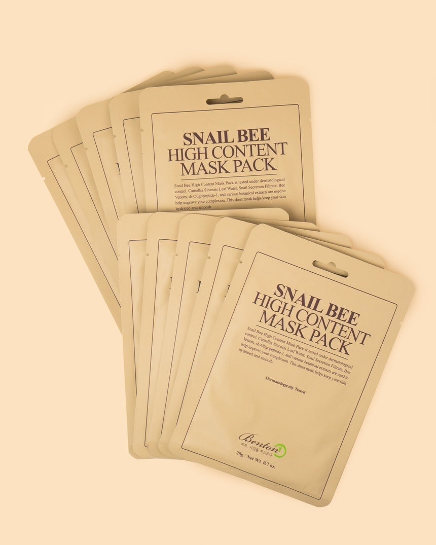 As featured on The Strategist, the Snail Bee High Content Mask Pack (Box of 10) from Benton is made of pure cotton and is soaked in snail mucin to deeply nourish and hydrate irritated skin. Bee venom extract helps improves skin tone and texture.